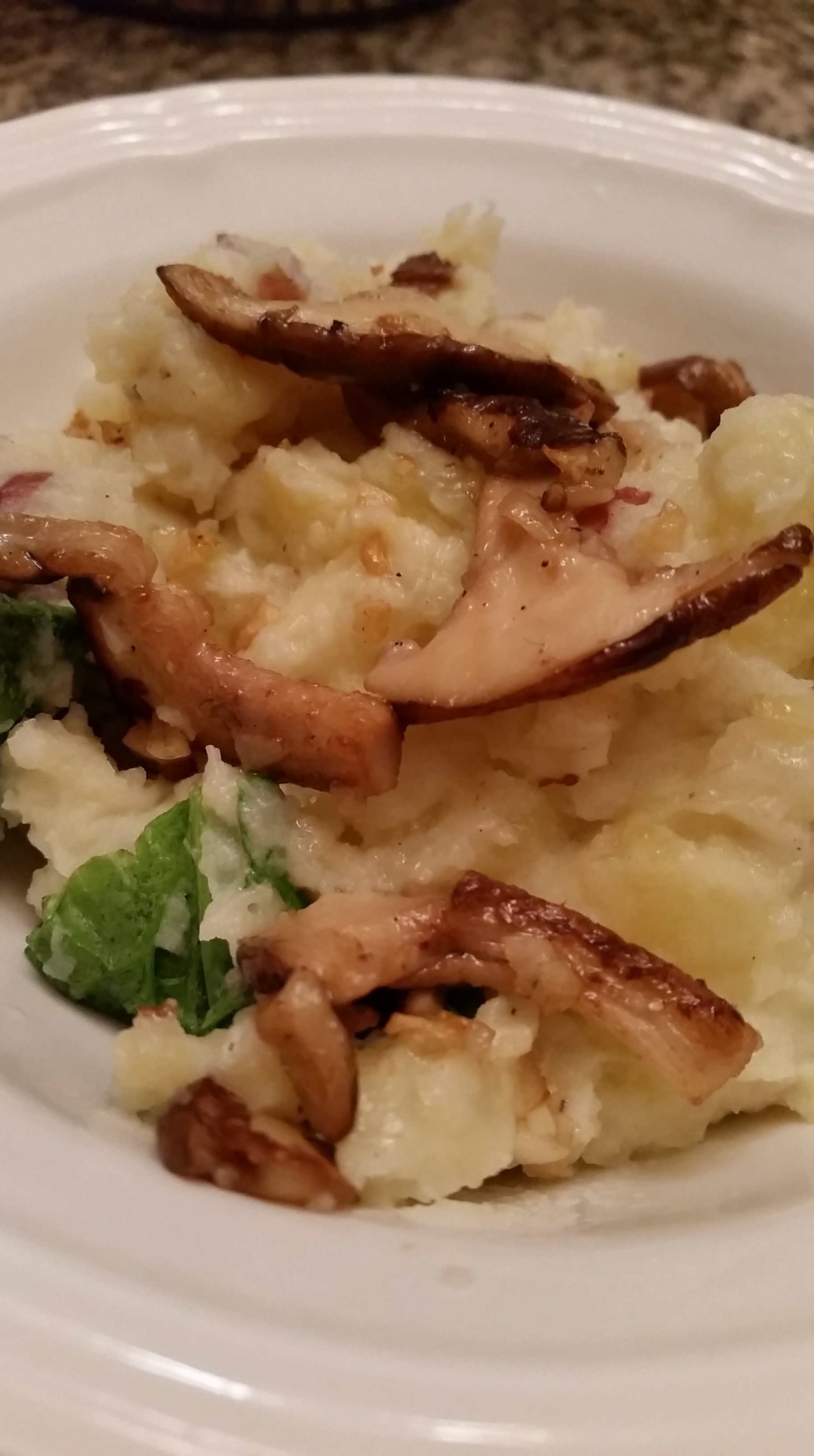 While the potatoes are freshly mashed and still hot, stir in a big handful of raw spinach. The heat will wilt the spinach. Then add your mushrooms. You can add them all in together or with individual servings.
