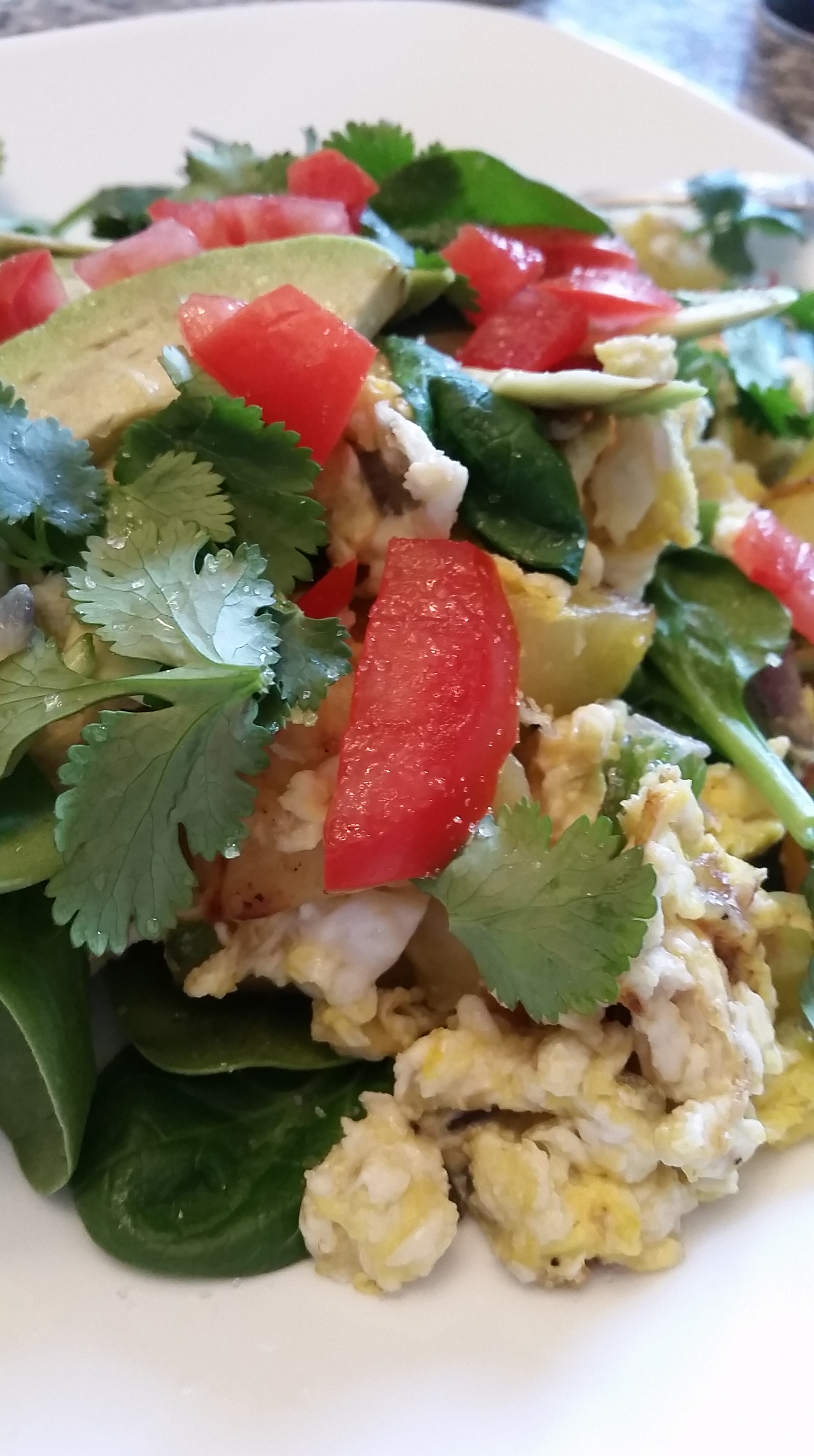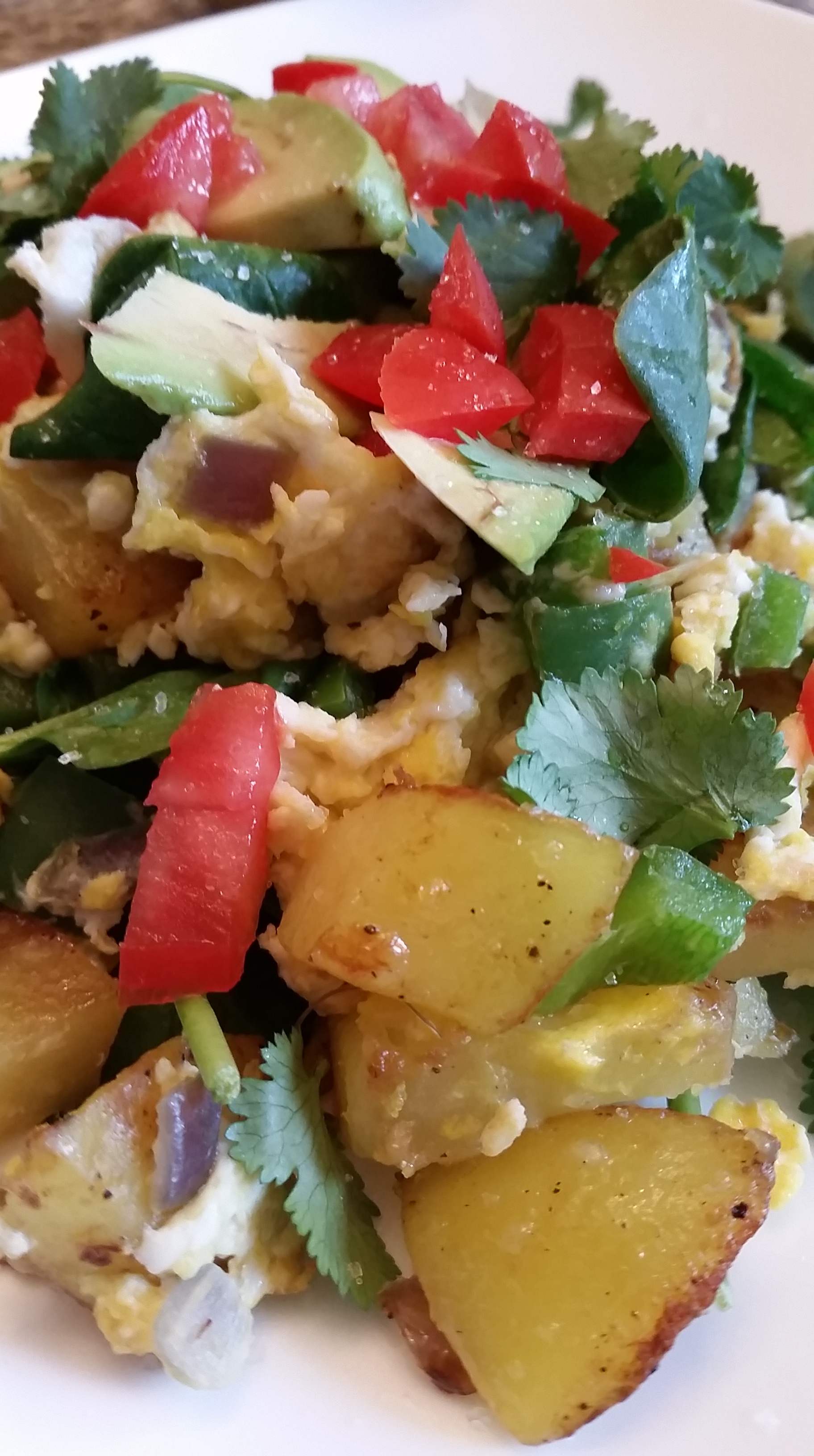 Once you have your potato, vegetable, and egg mixture on the plate, top with cilantro, diced tomato, and avocado. You can add any other toppings you desire. Make it your own creation!